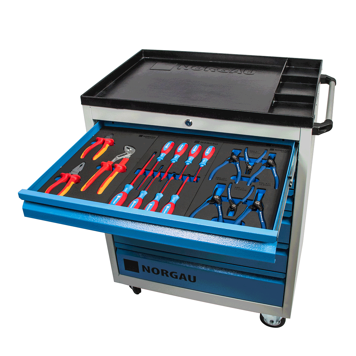 В линейке Norgau представлены удобные инструментальные тележки на колесах с 6 выдвижными ящиками. Их основные характеристики: